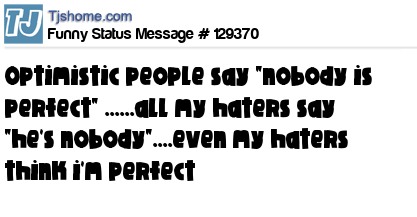 X says optimistic people say "nobody is perfect" ......all my haters say "he's nobody"....even my haters think i'm perfect