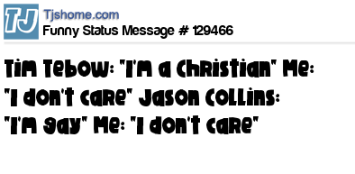 X Tim Tebow: "I'm a Christian" Me: "I don't care" Jason Collins: "I'm gay" Me: "I don't care"