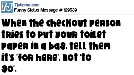 - # 43827 When the checkout person tries to put your toilet paper in a bag, tell them it's 'for here', not 'to go'. Then ask them to hurry.