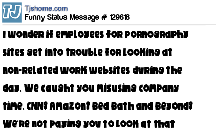 X I wonder if employees for pornography sites get into trouble for looking at non-related work websites during the day. We caught you misusing company time. CNN? Amazon? Bed Bath and Beyond? We're not paying you to look at that kind of crap.