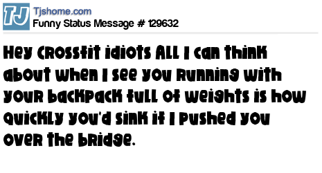 X says Hey Crossfit idiots All I can think about when I see you running with your backpack full of weights is how quickly you'd sink if I pushed you over the bridge.