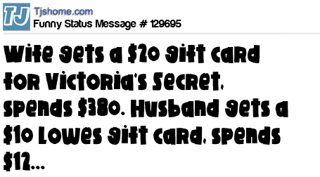 X Wife gets a $20 gift card for Victoria's Secret, spends $380. Husband gets a $10 Lowes gift card, spends $12...