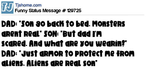 X says DAD: "Son go back to bed. Monsters arent real" SON: "But dad I'm scared. And what are you wearin?" DAD: "Just armor to protect me from aliens. Aliens are real son"