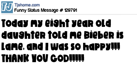 X says Today my eight year old daughter told me Bieber is lame, and I was so happy!!! THANK YOU GOD!!!!!