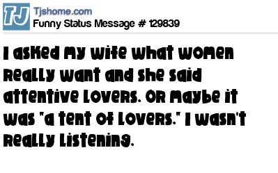 - # 137020 I asked my wife what women really want, she said attentive lovers. Or maybe she said "a tent of lovers." I wasn't really listening.