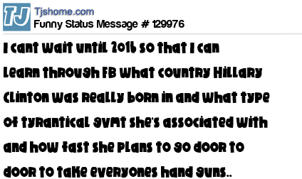 X I cant wait until 2016 so that I can learn through FB what country Hillary Clinton was really born in and what type of tyrantical gvmt she's associated with and how fast she plans to go door to door to take everyones hand guns..