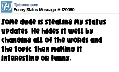 X says Some dude is stealing my status updates He hides it well by changing all of the words and the topic, then making it interesting or funny.