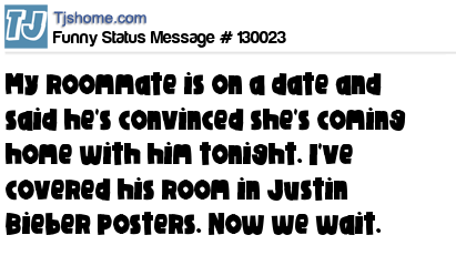 X is My roommate is on a date and said he's convinced she's coming home with him tonight. I've covered his room in Justin Bieber posters. Now we wait.