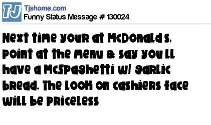 X Next time your at McDonald’s, point at the menu & say you’ll have a McSpaghetti w/ garlic bread. The look on cashiers face will be priceless