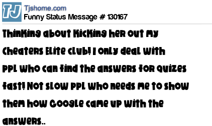 X Thinking about kicking her out my Cheaters Elite club! I only deal with ppl who can find the answers for quizes fast! Not slow ppl who needs me to show them how Google came up with the answers..