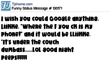 X I wish you could Google anything. Liikke, "Where the F you ck is my phone?" and it would be lliikke, "It's under the couch dumbass......lol good night peeps!!!!!