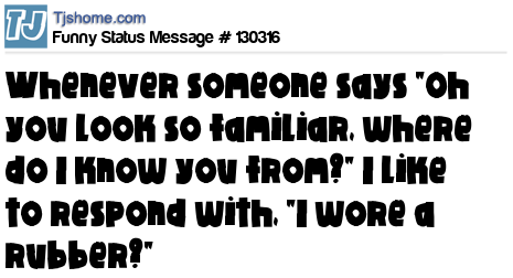 X Whenever someone says "Oh you look so familiar, where do I know you from?" I like to respond with, "I wore a rubber?"