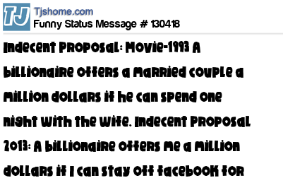 X Indecent Proposal: Movie-1993 A billionaire offers a married couple a million dollars if he can spend one night with the wife. Indecent Proposal 2013: A billionaire offers me a million dollars if I can stay off facebook for one night.