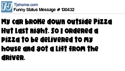 X My car broke down outside Pizza Hut last night. So I ordered a pizza to be delivered to my house and got a lift from the driver.
