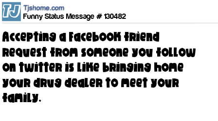 - # 178101 Accepting a Facebook friend request from someone you follow on twitter is like bringing home your drug dealer to meet your family