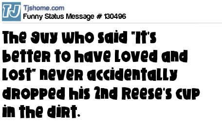 X The guy who said "It's better to have loved and lost" never accidentally dropped his 2nd Reese's cup in the dirt.