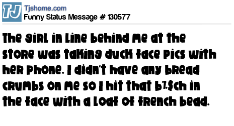 X The girl in line behind me at the store was taking duck face pics with her phone. I didn't have any bread crumbs on me so I hit that b%$ch in the face with a loaf of french bead.