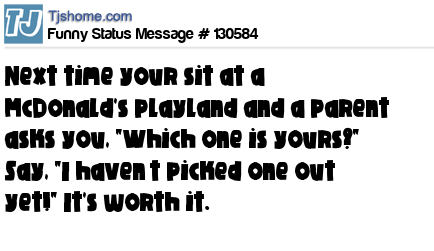 - # 59040 Next time you sit at a McDonald's playland and a parent asks you, "Which one is yours?" Say, "I haven't picked one out yet!" It's worth it.
