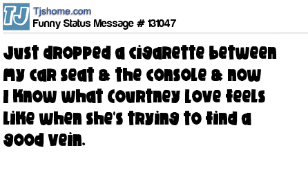 X says Just dropped a cigarette between my car seat & the console & now I know what Courtney Love feels like when she's trying to find a good vein.