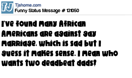 X says I've found many African Americans are against gay marriage, which is sad but I guess it makes sense. I mean who wants two deadbeat dads?