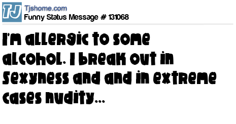 - # 131075 I'm allergic to alcohol. I break out in Sexyness and and in extreme cases nudity, walking pneumonia and the boogie woogie flu!