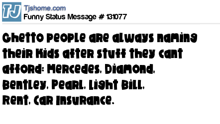 X Ghetto people are always naming their kids after stuff they cant afford: Mercedes, Diamond, Bentley, Pearl, Light Bill, Rent, Car Insurance.