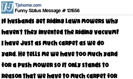 X is If husbands get riding lawn mowers why haven't they invented the riding vacuum? I have just as much carpet as we do yard. He tells me we have too much yard for a push mower so it only stands to reason that we have to much carpet for me to push vacuum! RIG