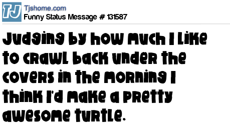 X Judging by how much I like to crawl back under the covers in the morning I think I'd make a pretty awesome turtle.