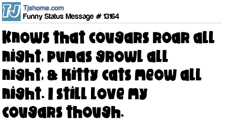 X knows that cougars roar all night, pumas growl all night, & kitty cats meow all night. I still love my cougars though.