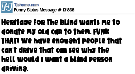 X Heritage For The Blind wants me to donate my old car to them. FUNK THAT! We have enought people that can't drive that can see why the hell would I want a blind person driving.