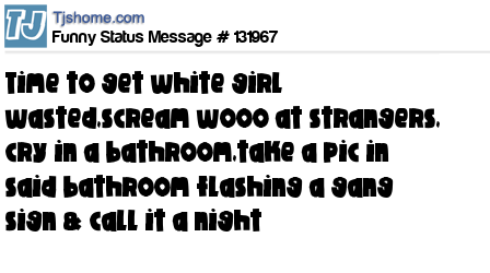X says Time to get white girl wasted,scream wooo at strangers, cry in a bathroom,take a pic in said bathroom flashing a gang sign & call it a night