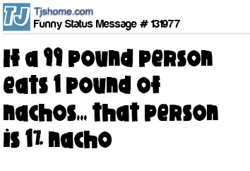 - # 209223 If I weigh 99 pounds and I eat 1 pound of nachos, am I 1percent nacho?