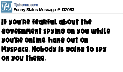 X If you're fearful about the government spying on you while you're online, hang out on Myspace. Nobody is going to spy on you there.