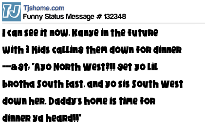 X says I can see it now, Kanye in the future with 3 kids calling them down for dinner ---> "Ayo North West?!! get yo lil brotha South East, and yo sis South West down her. Daddy's home is time for dinner ya heard!!"