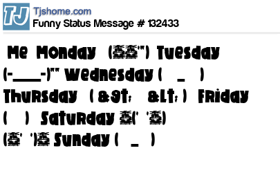 - # 99119 ME: Monday ƪ(´~`")∫ Tuesday (-____-)"" Wednesday (⌣́_⌣̀) Thursday Ҩ( > ̯ < )Ҩ Friday (ˆ⌣ˆ)ง Saturday ~('▽'~) (~'▽')~ Sunday (˘ʃ_ƪ˘)