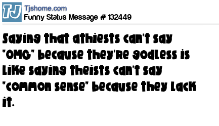 X Saying that athiests can't say "OMG" because they're godless is like saying theists can't say "common sense" because they lack it.