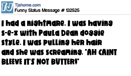 X I had a nightmare. I was having s-e-x with Paula Dean d0ggie style. I was pulling her hair and she was screaming, "AH CAINT BLEEVE IT'S NOT BUTTER!"