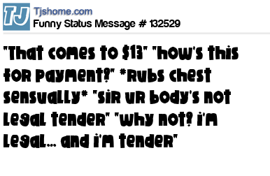 X says "That comes to $13" "how's this for payment?" *rubs chest sensually* "sir ur body's not legal tender" "why not? i'm legal… and i'm tender"