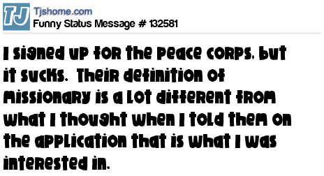 X I signed up for the peace corps, but it sucks. Their definition of missionary is a lot different from what I thought when I told them on the application that is what I was interested in.