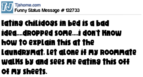 X says eating chilidogs in bed is a bad idea....dropped some....i don't know how to explain this at the laundrymat, let alone if my roommate walks by and sees me eating this off of my sheets.
