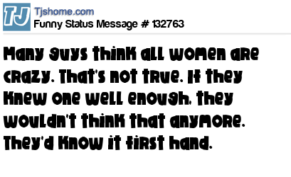 X says Many guys think all women are crazy. That's not true. If they knew one well enough, they wouldn't think that anymore. They'd know it first hand.