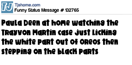 X says Paula Deen at home watching the Trayvon Martin case just licking the white part out of Oreos then stepping on the black parts