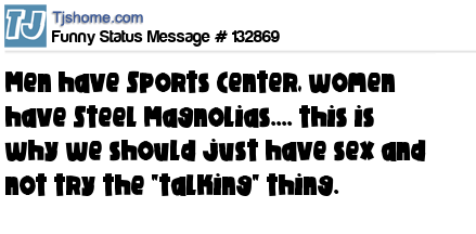 X says Men have Sports Center, women have Steel Magnolias.... this is why we should just have sex and not try the "talking" thing.