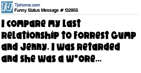 X says i compare my last relationship to Forrest Gump and Jenny. I was retarded and she was a w*ore...