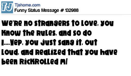 X We're no strangers to love, you know the rules, and so do I....Yep, you just sang it, out loud, and realized that you have been RickRolled \m/
