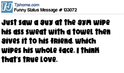X says Just saw a guy at the gym wipe his ass sweat with a towel then gives it to his friend, which wipes his whole face. I think that's true love.