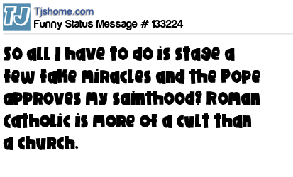 X says So all I have to do is stage a few fake miracles and the Pope approves my sainthood? Roman Catholic is more of a cult than a church.