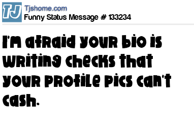 - # 149631 I never hit on women with profile pics that are tilted. If she's too lazy to rotate her pics once what makes you think she'll ever want to be on top?