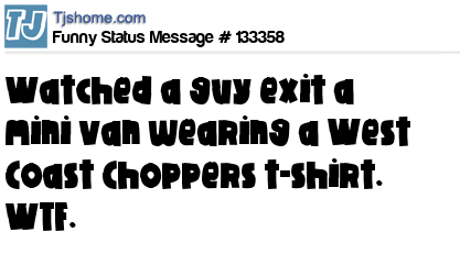 X says Watched a guy exit a mini van wearing a West Coast Choppers t-shirt. WTF.
