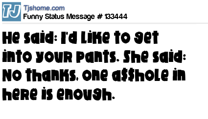 X says He said: I'd like to get into your pants. She said: No thanks, one a$$hole in here is enough.
